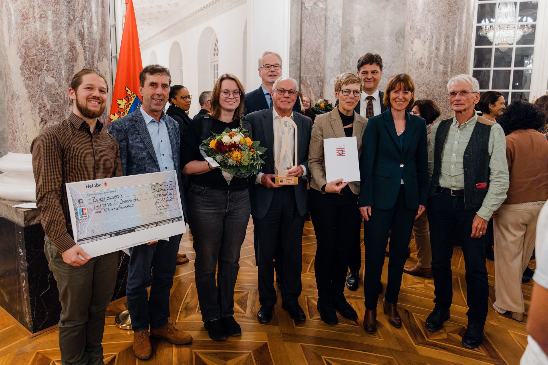 das war ein grandioser Tag gestern für unsere noch junge Initiative! Wir waren zu acht in Wiesbaden und haben im wunderschönen Schloss Biebrich aus den Händen der Hessischen Arbeits- und Sozialministerin Heike Hofmann den Hessischen Integrationspreis 2024 verliehen bekommen - genauer: wir gewannen einen der dritten Plätze, dotiert mit 2.000 Euro. Unsere Freude und Dankbarkeit war riesig, ist dies doch neben der materiellen Anerkennung auch eine große ideelle Auszeichnung für das Engagement, das wir zugunsten von Demokratie und Mitmenschlichkeit an den Tag legen und das wir auch dauerhaft fortsetzen wollen. Dazu ist dieser Preis uns ein Ansporn.